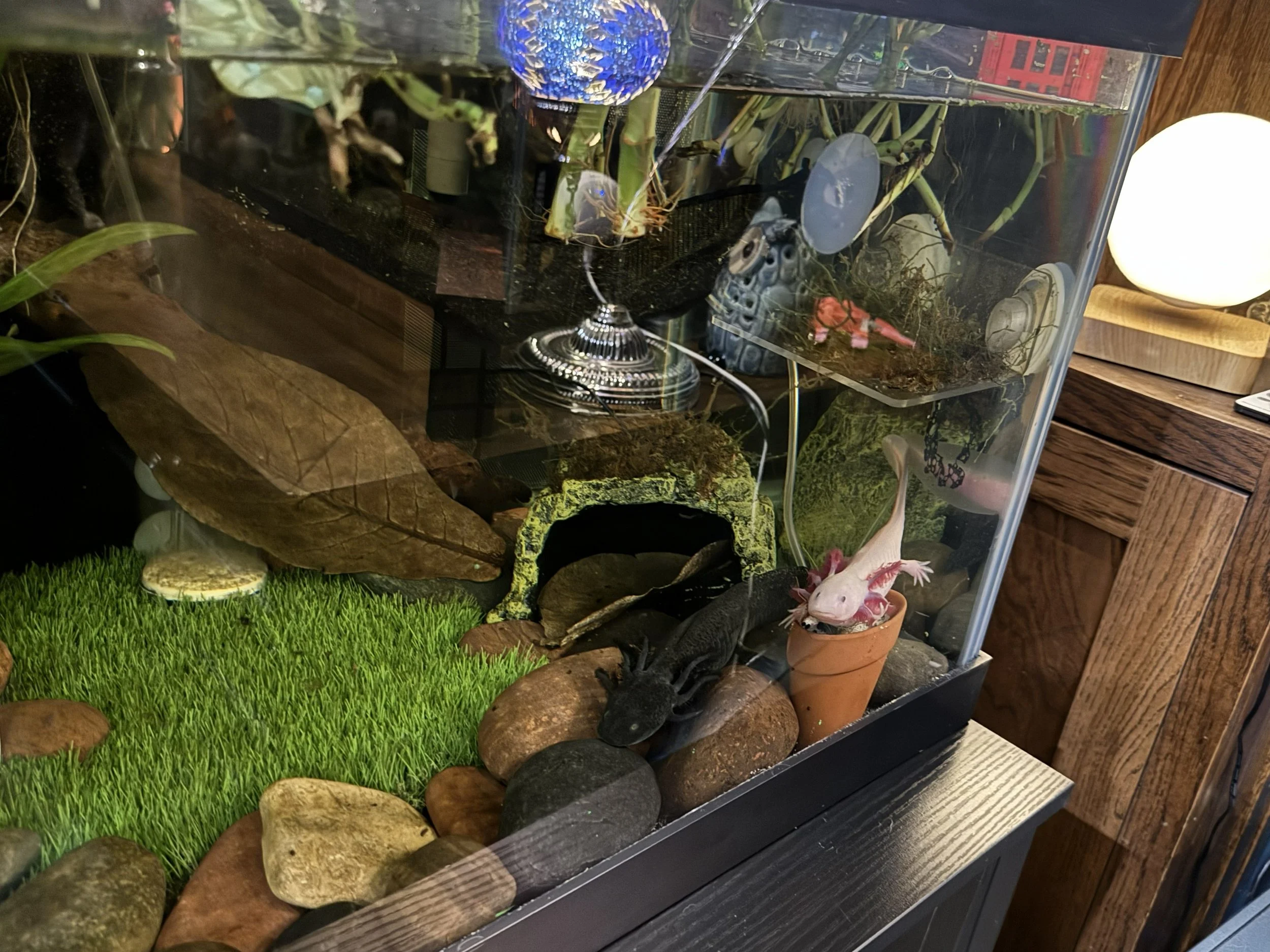 Paul recently moved in with her bestie Hootie in late February 2026. They hit it off almost instantly and spend most days/nights playing, watching mom work, or watching tv (fish on YouTube being their favorite). They share a 60g long planted tank with lots of fun hiding spots, slides, hammocks and shelves. Paul has always been a great eater and enjoys European Earth worms from Axolotl Planet or Red Wigglers from Walmart. As a special treat on occasion, she will get some nibbles of Raw Salmon and even black worms when her Pea Puffer cousins and new baby axies get fed.