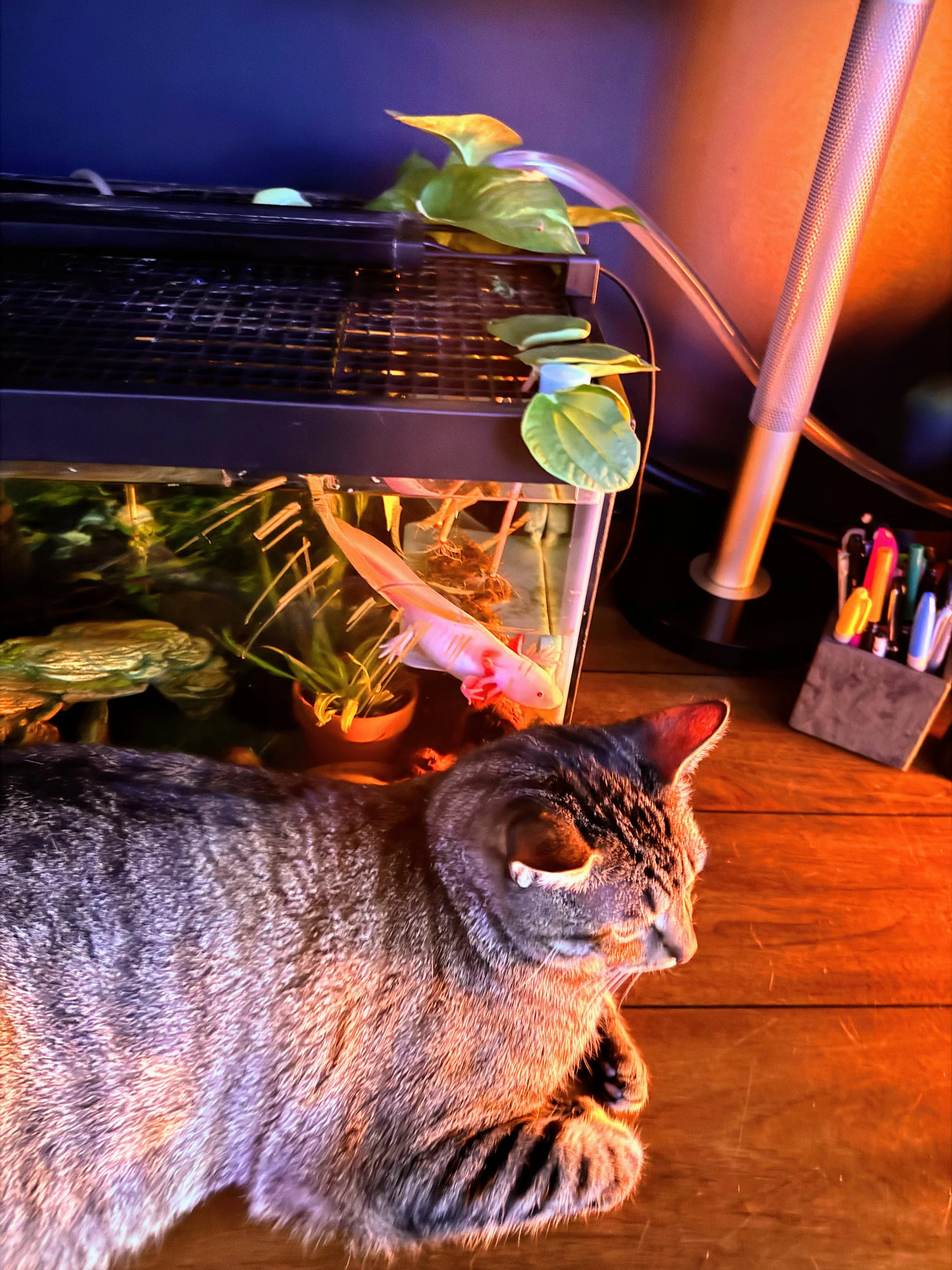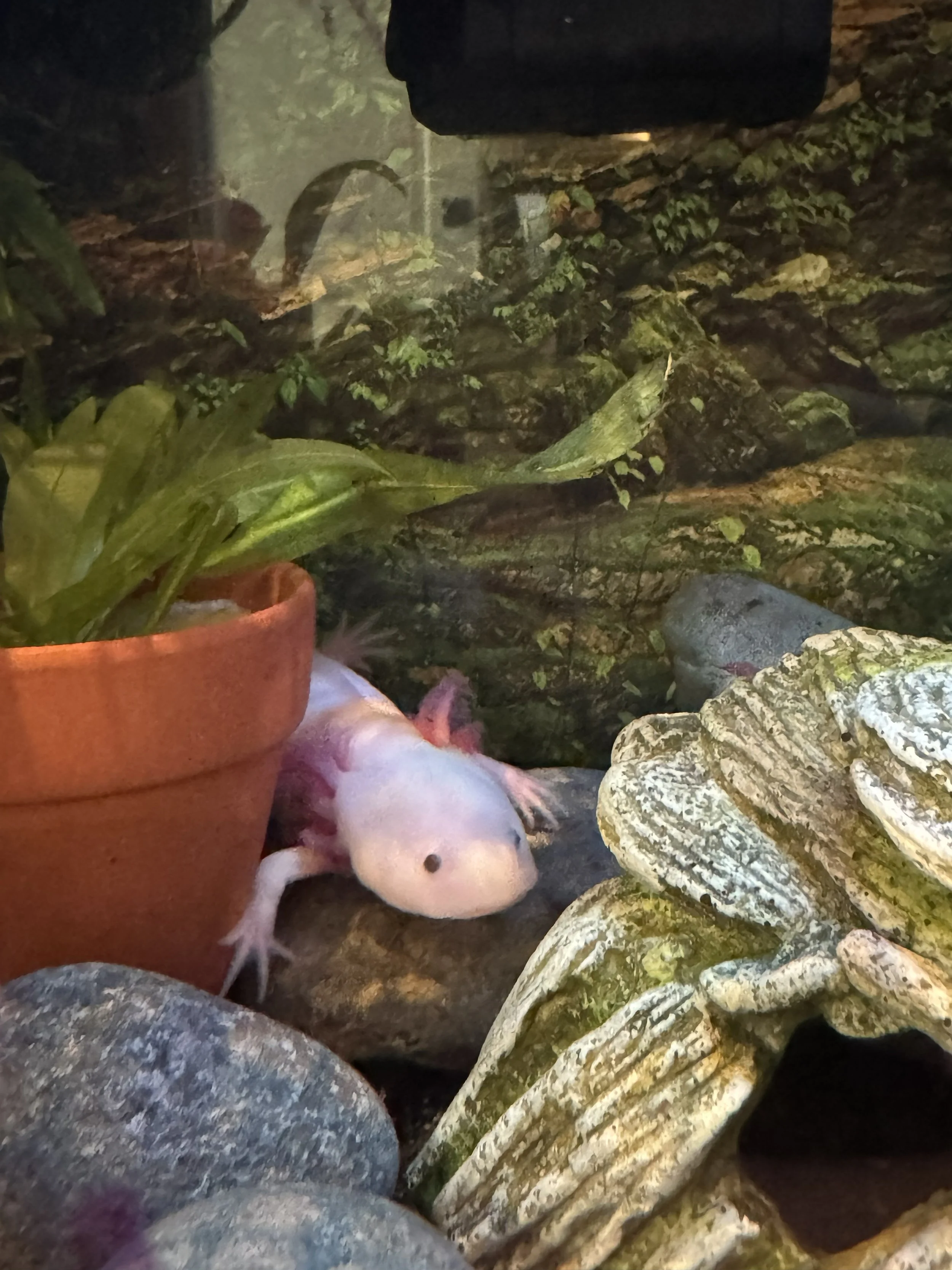Meet Paul!! Paul is our most recent addition. She came to us to be a companion to Hootie after all her other “friends” ended up being boys. Paul came to us as a “probable” female, so we swiftly named her PAUL to add a little extra protection that she would indeed be a girlfriend for Hootie. She made the long trip overnight from Southeastern Axolotls in Georgia to our home in Irving, TX in December of 2025. She spent her first couple of months acclimating in our 20g long “isolation” tank. While shy for the first couple of weeks; she quickly got the hang of things and made fast friends with our latest rescue cat (BAC - you will get to see quite a bit, as he plays mother hen to all new kids in the house). Paul spends lots of time watching mom work; since the isolation tank sits on mom’s desk in perfect eye shot of her work webcam. Paul is quite a ham when there are lots of people on video calls and has made quite an impression with people all over the US. She has become the “virtual” pet axie for kiddos with parents working from home all over the US.